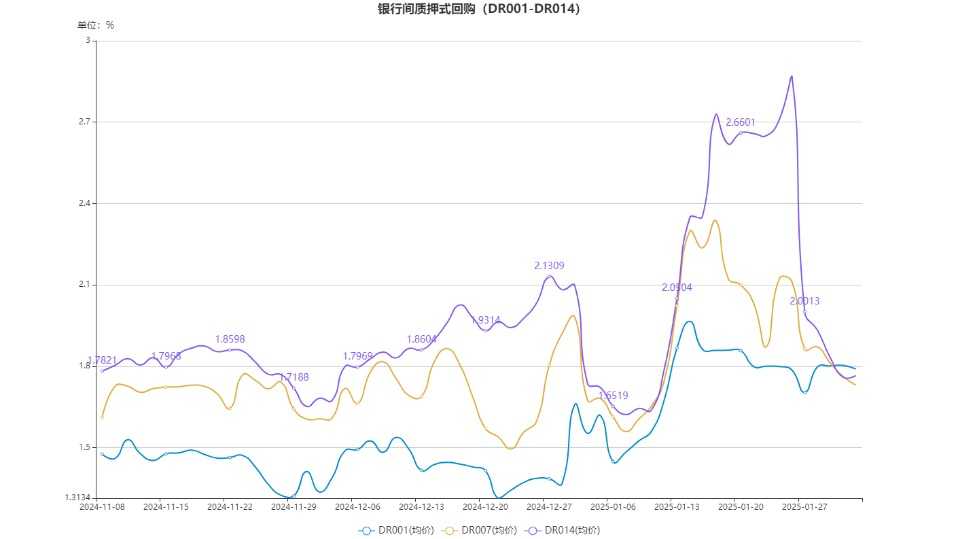 在银行间质押式回购市场,多数品种的成交量与价格均呈现下跌趋势,隔夜品种与7天、14天品种之间的倒挂现象依旧存在。值得注意的是,R007的成交占比大幅下降至4.8%。具体来看,DR001和R001的加权平均利率分别下行1.4BP和3.0BP,报收于1.7897%和1.7718%,成交额分别减少934亿元和446亿元;DR007和R007的加权平均利率分别下行3.3BP和5.7BP,报收于1.7304%和1.7313%,成交额分别减少974亿元和3530.8亿元(原文为35308亿元,此处假设为笔误并修正);DR014和R014的加权平均利率分别变动0.6BP下行和4.3BP下行,报收于1.7652%和1.7619%,成交额分别增加32亿元和减少896亿元。