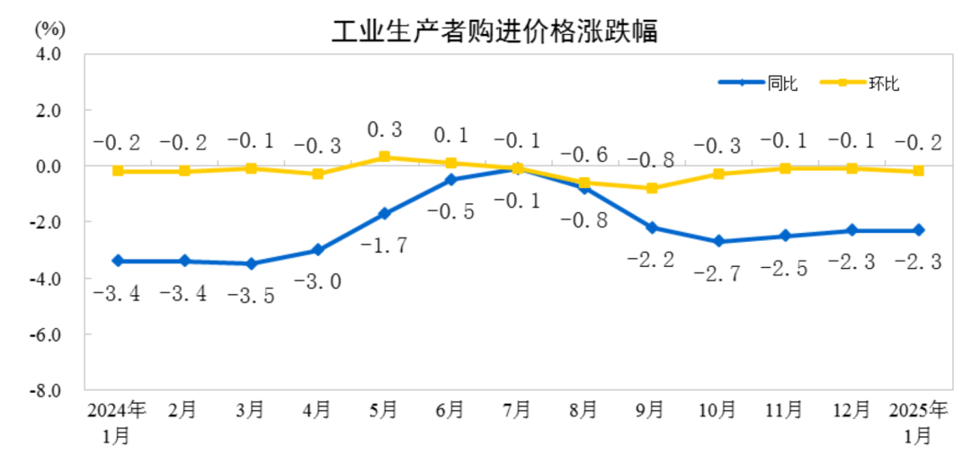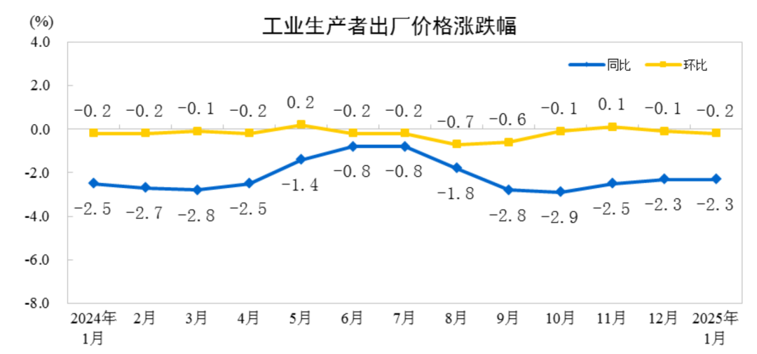 此外,2025年1月份工业生产者出厂价格和购进价格同比均下降2.3%,环比均下降0.2%。在生产资料和生活资料分类中,多数价格呈现下降趋势,但有色金属材料及电线类价格同比上涨显著。