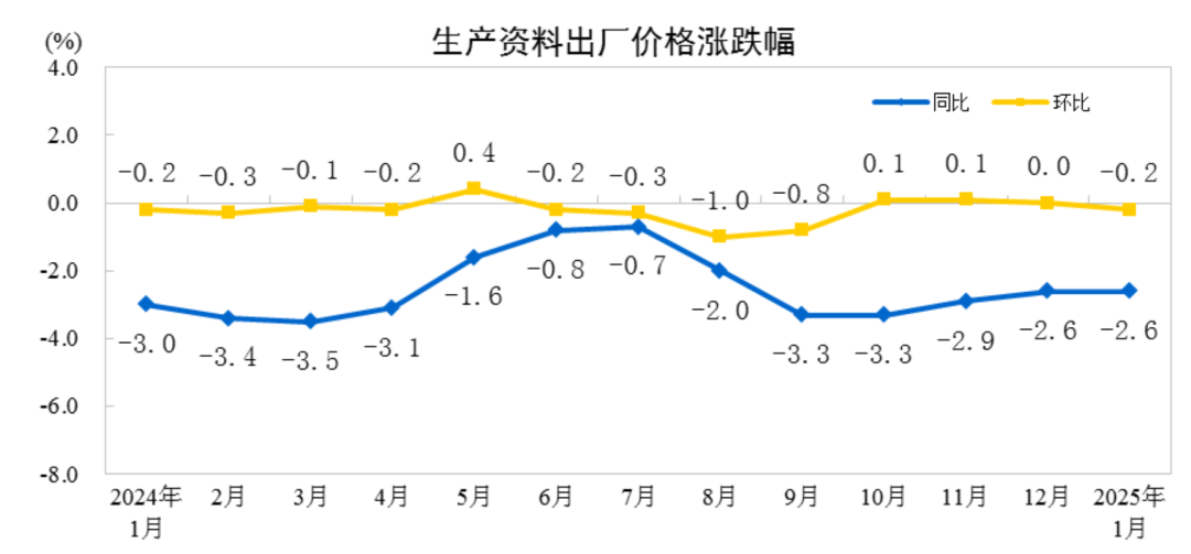2025年1月份,全国工业生产者出厂价格和购进价格同比均下跌2.3%,环比亦均下跌0.2%。