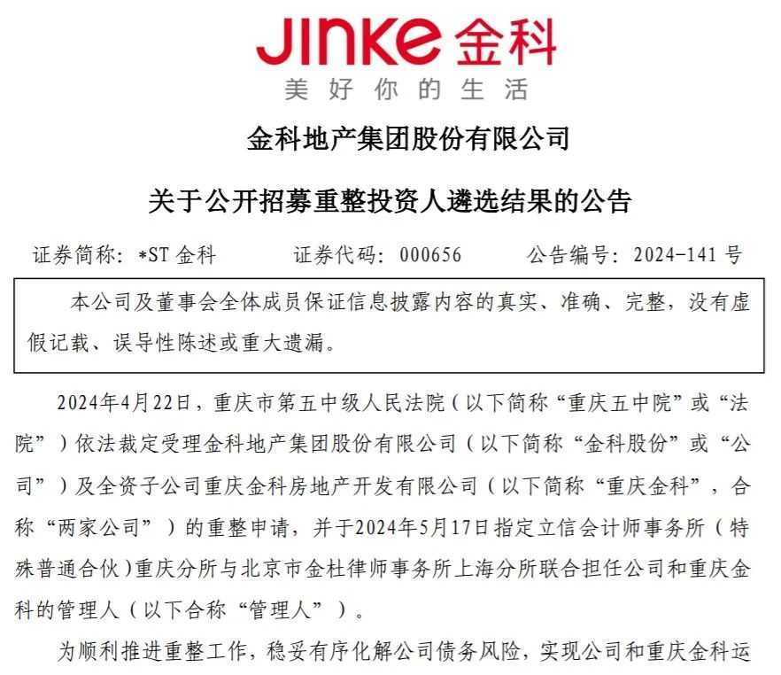 昔日“千亿房企”金科股份(*ST金科:SZ000656)在历经18个月的重整历程后,终于迎来了新的生机。去年5月22日提出重整,至11月22日晚间,金科股份公告确认上海品器管理咨询有限公司及北京天娇绿苑房地产开发有限公司联合体为金科股份及重庆金科中选重整投资人。