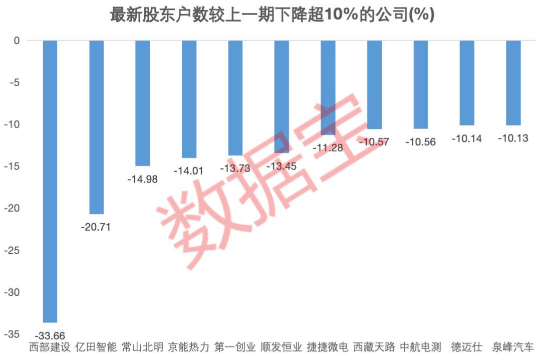 截至11月22日,近300家公司披露了最新股东户数,其中153家公司股东户数下降。45家公司股东户数下降幅度超过5%,11家公司下降幅度超过10%。西部建设股东户数下降幅度最高,达33.66%,亿田智能股东户数下降20.71%,这两家公司在最新收盘日均跑赢上证指数。此外,常山北明、京能热力、第一创业、顺发恒业4家公司股东户数下降均超过13%。