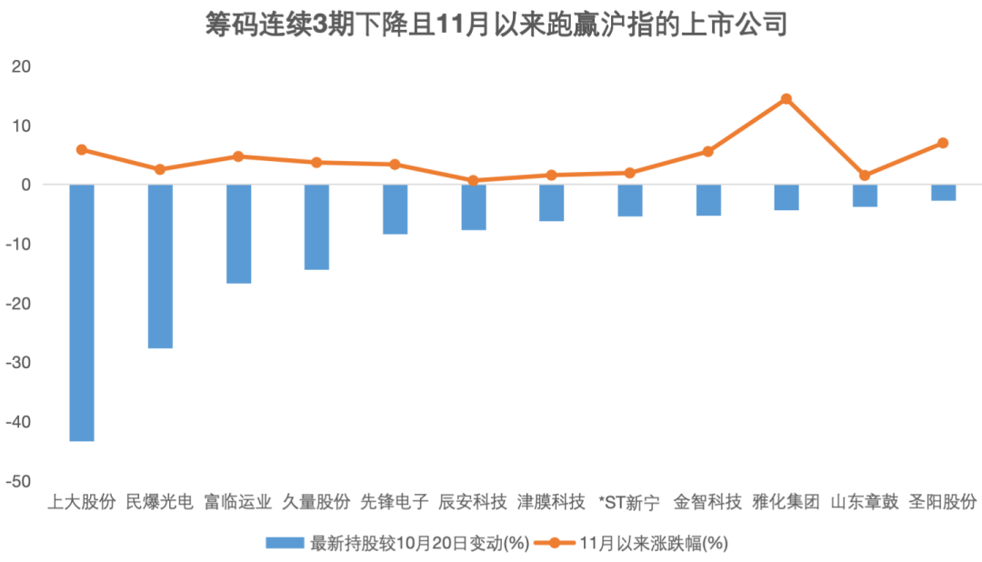 进一步分析显示,有28家公司股东户数连续3期下降,主要分布在机械设备、电子、计算机等高端制造、科技行业。这些公司平均市值约90亿元,其中3家公司市值超过百亿元。11月以来,这些公司股价平均小幅跑赢上证指数,其中雅化集团、圣阳股份、上大股份及金智科技涨幅均超过5.5%。与10月20日相比,28家公司最新股东户数下降幅度均超过2%,上大股份下降超过40%,民爆光电、达威股份下降25%以上。