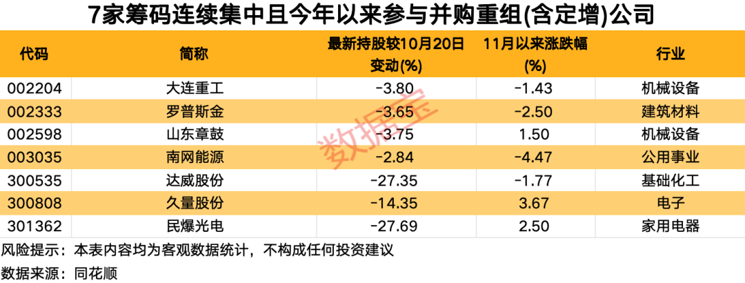 通常而言,并购重组利好未来发展,筹码集中也备受市场关注。据统计,以上筹码连续集中的28家公司中,7家公司今年以来披露并购重组最新进展,涉及案件20起。其中,达威股份披露了1.15亿元的重组事件,久量股份年内有2起并购重组案件,大连重工披露6起并购重组事项进展,交易价值合计超过10亿元。此外,罗普斯金、山东章鼓等筹码连续集中股也披露了并购重组进展。