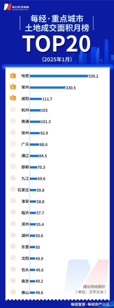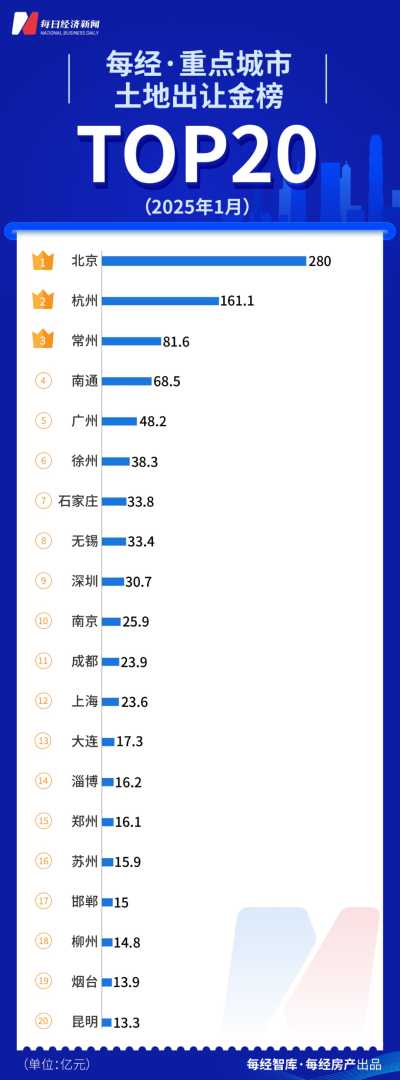 2025年首月,上市房企排名争夺异常激烈,保利发展、中海地产等位居前列。同时,土地出让金TOP20城市合计出让金额增长近百亿元,建设用地成交面积也有所提高,但全国300城供推出用地同比减少,揭示了房地产市场面临的挑战。