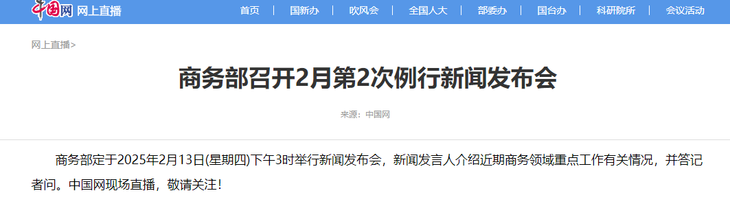商务部定于2025年2月13日(星期四)下午3时举行新闻发布会,新闻发言人将介绍近期商务领域重点工作有关情况,并回答记者提问。