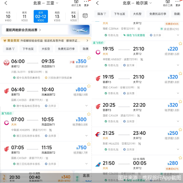 从冬季热门旅游目的地来看,此时也是错峰出游的最佳时机。据携程旅行App,2月12日北京直飞三亚的最低票价为300元,票价折扣仅为0.8折,同时还有不少1—2折的机票在售;同样,北京飞往哈尔滨的机票票价也有所回落,2月12日北京直飞哈尔滨的最低机票为220元,折扣为1.5折。