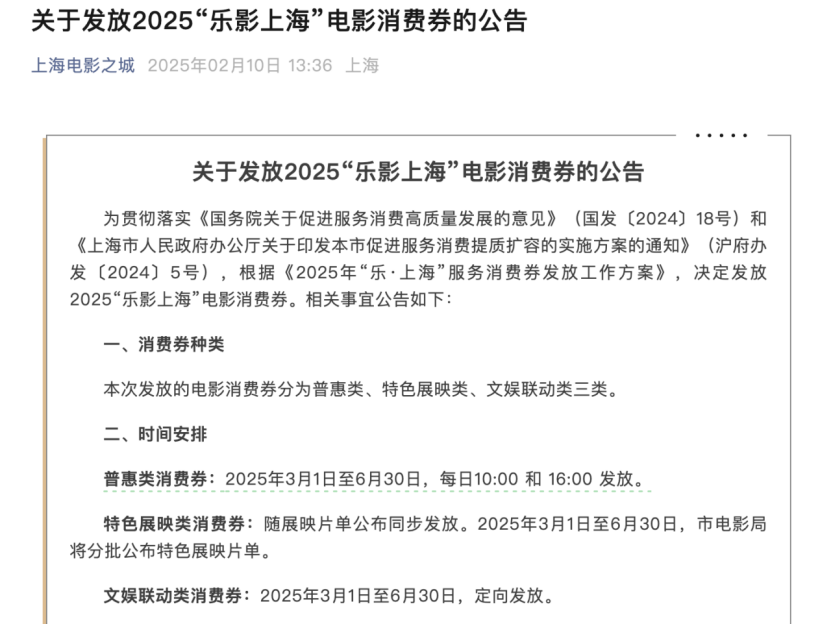 为提振电影消费,近年来,上海市已连续多年发放电影消费券。此前,上海市于2024年9月28日至12月31日期间,联合淘票票、猫眼两大头部票务平台发放了总价值4500万元的电影消费券。