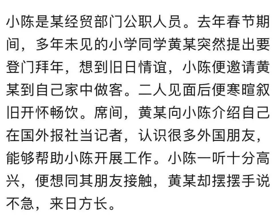 据“国家安全部”微信公众号消息,近年来,境外间谍情报机关不择手段地搜集内部敏感信息,特别是在春节等重要传统节日期间,以人情往来为名,行勾连窃密之实,手段隐蔽,具有较强迷惑性,危害国家安全。