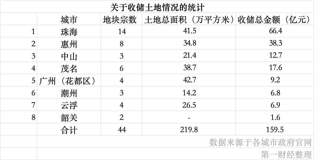 2月6日以来,珠海、广州、惠州、中山等8个广东省内城市纷纷发布了政府利用专项债收购存量土地的公告,涉及土地44宗,收储总金额超159亿元。