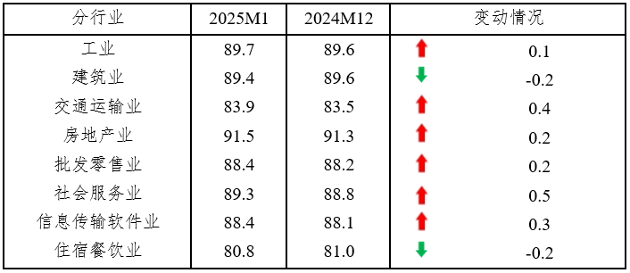 1月份,工业、交通运输业、房地产业、批发零售业、社会服务业、信息传输软件业指数由降转升,较上月分别上升0.1、0.4、0.2、0.2、0.5和0.3点。建筑业、住宿餐饮业指数继续下降,较上月各下降0.2点。