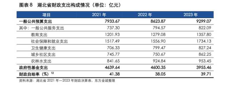在财政收入、债务收入等支撑下,去年湖北财政支出保持一定力度,推动当地经济稳步回升。湖北预算报告数据显示,2024年湖北一般公共预算支出9974亿元,同比增长7.3%。这一增速高于全国地方平均支出增速(3.2%)。2024年全省政府性基金支出4486亿元,同比增长13%。另外当地去年社会保险基金支出约4561亿元,同比增长约8%。