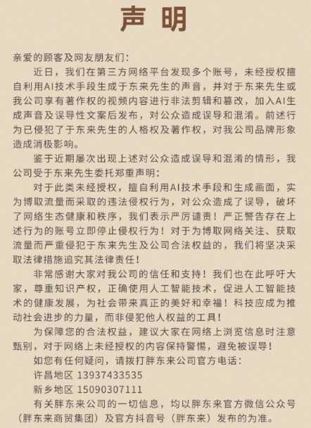 11月24日,胖东来商贸集团正式发布声明,指出近期在多个第三方网络平台发现未经授权的账号,利用先进的AI技术模拟创始人于东来的声音,并对公司享有版权的视频内容进行非法剪辑和篡改。这些账号在加入AI生成的声音及具有误导性的文案后,将内容发布到网络上,对公众造成了严重的误导和混淆。