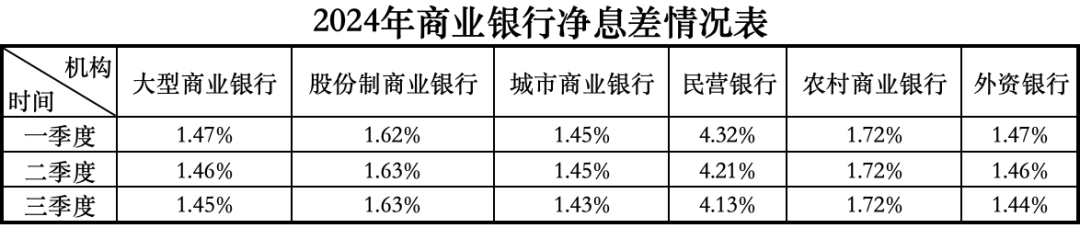 据该总局统计数据显示,今年三季度商业银行净息差已降至1.53%,环比二季度下降了0.01个百分点。具体来看,大型商业银行、股份制商业银行、城市商业银行、民营银行、农村商业银行及外资银行的净息差分别为1.45%、1.63%、1.43%、4.13%、1.72%及1.44%。其中,除股份制商业银行和农村商业银行的净息差保持稳定外,其余类型银行的净息差均有所下降。