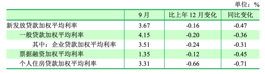 值得注意的是,随着商业银行不断压降负债成本,当前贷款加权平均利率水平也在不断下行。据2024年三季度货币政策执行报告显示,贷款加权平均利率持续处于历史低位。今年9月,新发放贷款加权平均利率为3.67%,同比下降0.47个百分点,其中个人住房贷款加权平均利率同比下降0.71个百分点。