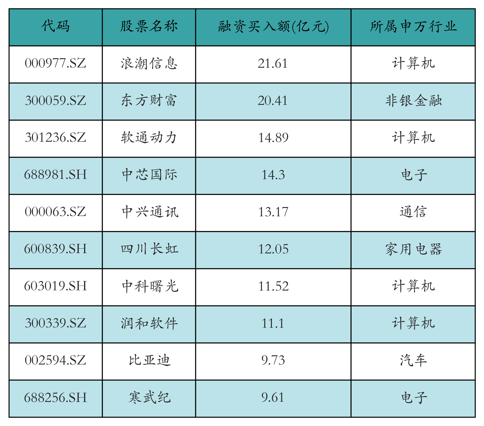 昨日沪深两市的融资融券余额为18360.06亿元,其中融资余额18252.83亿元,融券余额107.23亿元。两市融资融券余额较前一交易日增加193.48亿元。分市场来看,沪市两融余额为9437.84亿元,相较前一交易日增加87.08亿元;深市两融余额8922.22亿元,相较前一交易日增加106.4亿元。两市共有3401只个股有融资资金买入,其中浪潮信息、东方财富、软通动力排名前三,买入金额分别21.61亿元、20.41亿元、14.89亿元。融资买入额前10个股详情见下表: