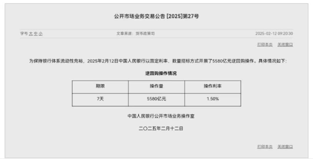 2月12日,中国人民银行以固定利率、数量招标方式开展了5580亿元7天期逆回购操作,操作利率为1.50%,旨在保持银行体系流动性充裕。