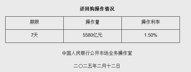 2025年2月12日,中国人民银行开展5580亿元7天逆回购操作,中标利率1.50%,因有6970亿元逆回购到期,央行当日净回笼资金1390亿元,旨在保持银行体系流动性充裕。