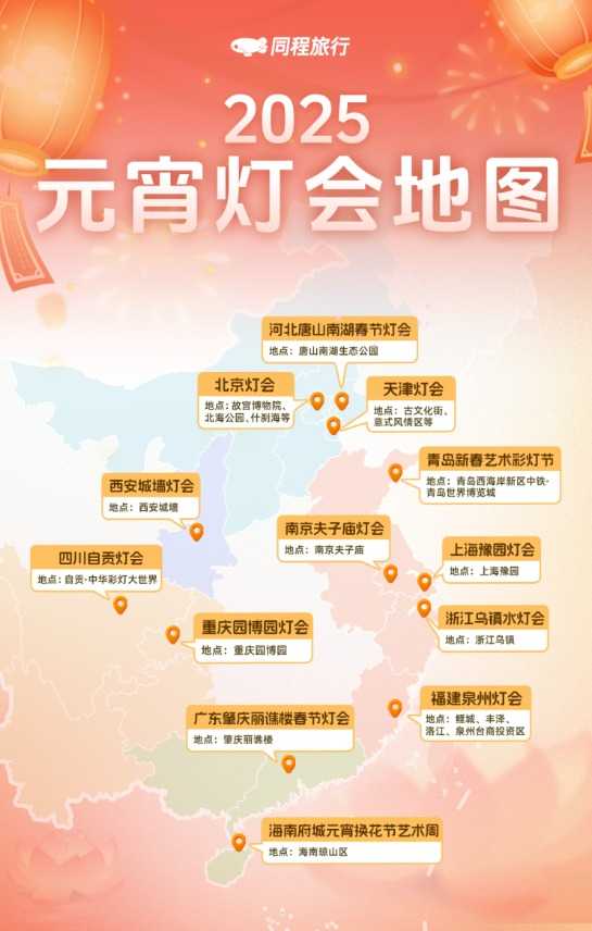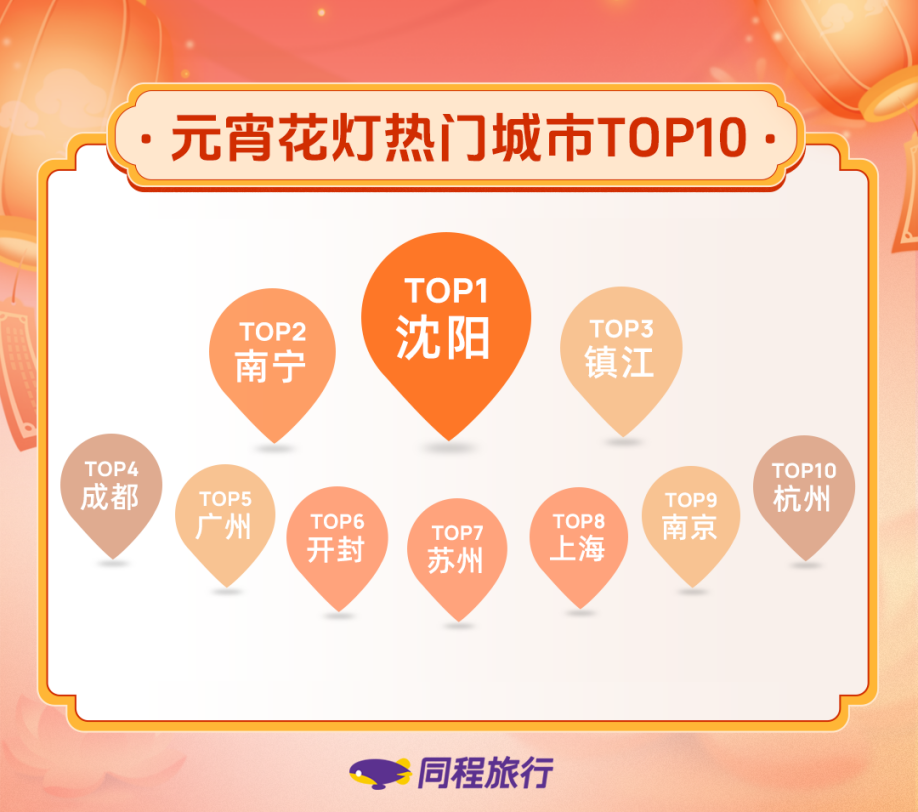 根据同程旅行发布的《2025年元宵节非遗灯会赏灯地图》,元宵灯会十大热门城市中,沈阳居首,其次是南宁、镇江、成都、广州、开封、苏州、上海、南京、杭州。