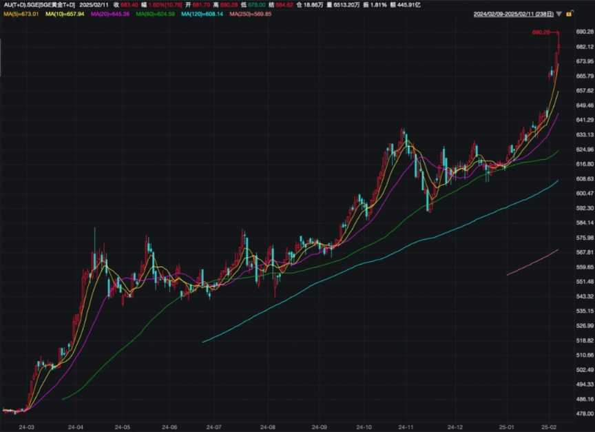 2月11日,上海黄金交易所黄金T+D合约再度上涨1.6%,报收于683.4元/克;今年以来该合约连续上涨,年初至今涨幅超过11%。