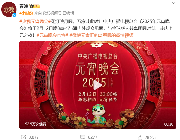 据微博号“春晚”最新预告,中央广播电视总台《2025年元宵晚会》将于2月12日晚8点档与海内外观众见面。