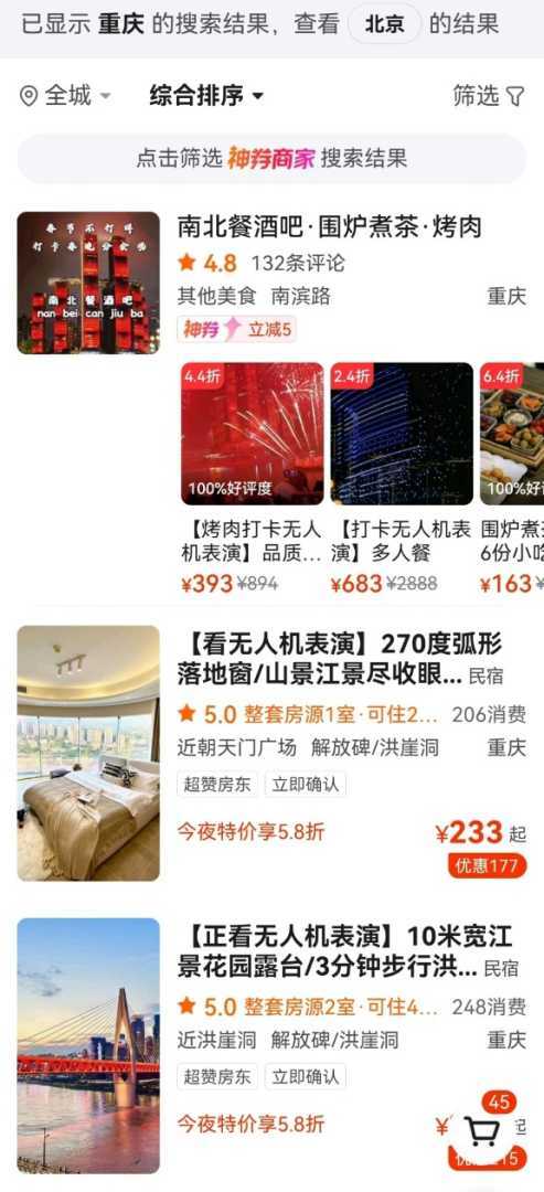 “科技+传统”带动元宵节新消费。美团App上,多家重庆餐厅、火锅店推出“观无人机灯光秀套餐”,临江酒店、民宿也将能观赏无人机表演的高层、大露台房型作为卖点,搜索量暴增。