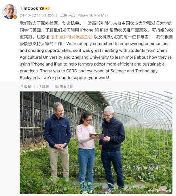 10月21日,库克再次通过微博表达了对北京的喜爱,次日他与中国农业大学和浙江大学的同学们见面,了解他们如何利用iPhone和iPad推动农业创新。