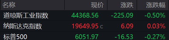 美股周三涨跌互现,高于预期的通胀数据加剧了美联储短期内不会降息的担忧,而CVS 健康等一些乐观的财报则提振了市场信心,中概股表现不俗。截至收盘,道指跌225.09点,跌幅0.50%,报44368.56点,纳指涨0.03%,报19649.95点,标普500指数跌0.27%,报6051.97点。