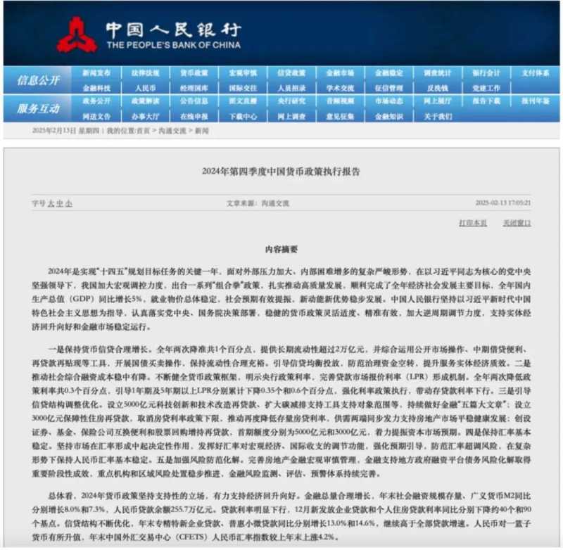 2月13日,央行发布《2024年第四季度中国货币政策执行报告》,强调坚持支持性货币政策立场,深化金融改革和高水平对外开放,促进经济稳定增长。报告提出多项政策举措,包括完善公开市场操作体系、加大金融支持力度等。