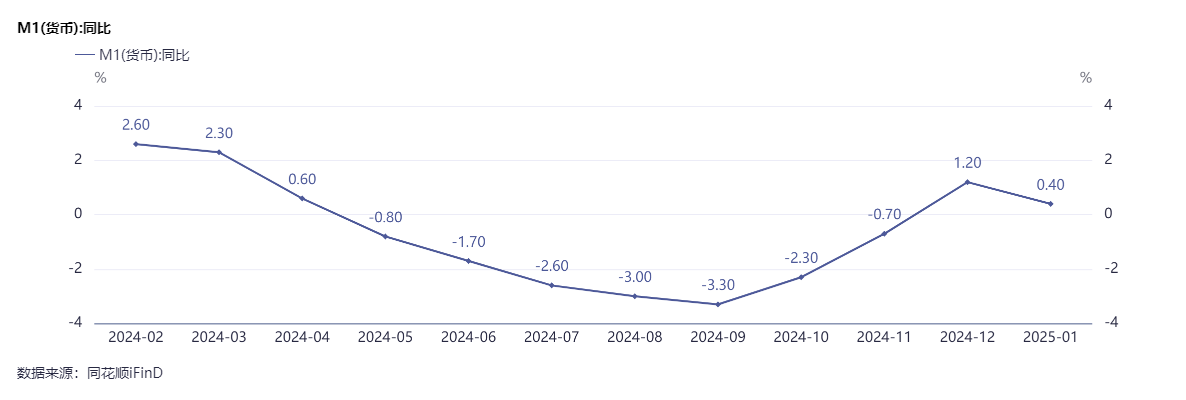 2025年1月起,狭义货币M1统计口径调整,将个人活期存款和非银支付机构客户备付金纳入。1月末,M1余额112.45万亿元,同比增长0.4%。这一调整有助于缓解春节前企业-居民活期存款的波动。