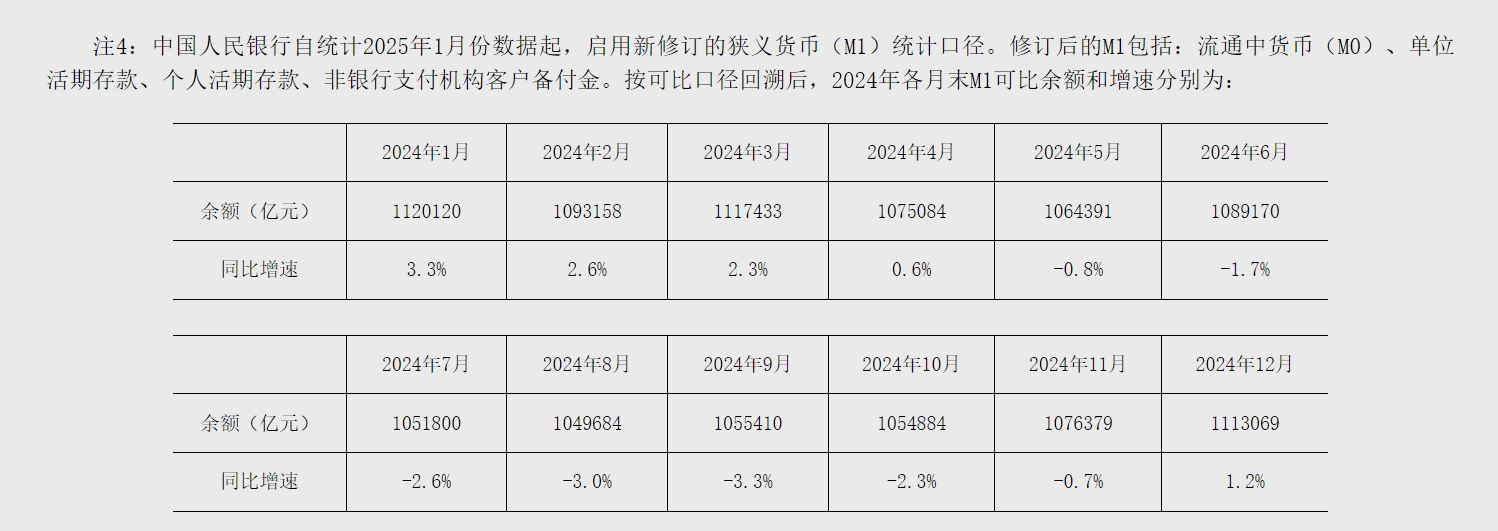 值得注意的是,央行报告还提到,自2025年1月起,启用新修订的狭义货币(M1)统计口径,这将更全面地反映货币供应情况。