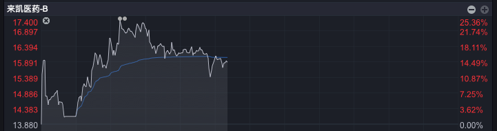 早盘,来凯医药-B(02105.HK)股价一度飙升超过22%,创下年内新高。截至发稿时,涨幅虽有所收窄,但仍高达14.55%,股价报15.88港元/股。