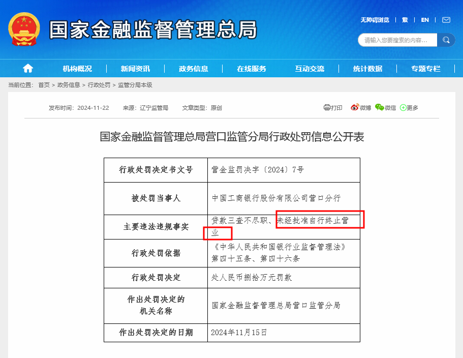 财联社11月25日讯近日,一起国有大行银行网点未经批准自行终止营业的事件引发监管处罚。中国工商银行股份有限公司营口分行因贷款三查不尽职及擅自停业,被国家金融监管总局处以80万元罚款,相关责任人亦受罚。