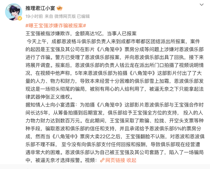 11月21日,有自媒体博主爆料称,成都恩波格斗俱乐部向警方报案,指王宝强及其公司涉嫌诈骗,金额高达1亿。该博主称,俱乐部与王宝强公司合作拍摄电影《八角笼中》,投入数百万,但王宝强承诺的5%票房分成(约1.1亿)未兑现,导致俱乐部经营困难。