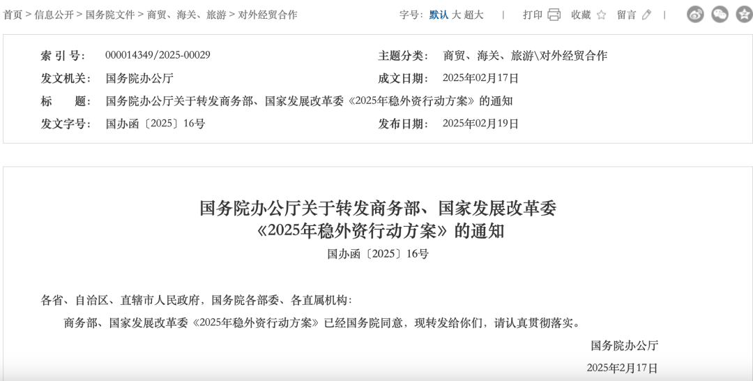 2月19日,中国政府网发布国务院办公厅关于转发商务部、国家发展改革委《2025年稳外资行动方案》(下称《行动方案》)的通知。通知提到,扩大电信、医疗、教育等领域开放试点,落实全面取消制造业领域外资准入限制要求,鼓励外资在华开展股权投资,持续打造“投资中国”品牌,取消外商投资性公司使用境内贷款限制等,以进一步吸引和利用外资。