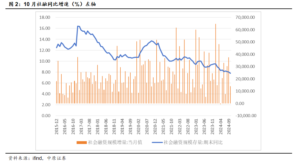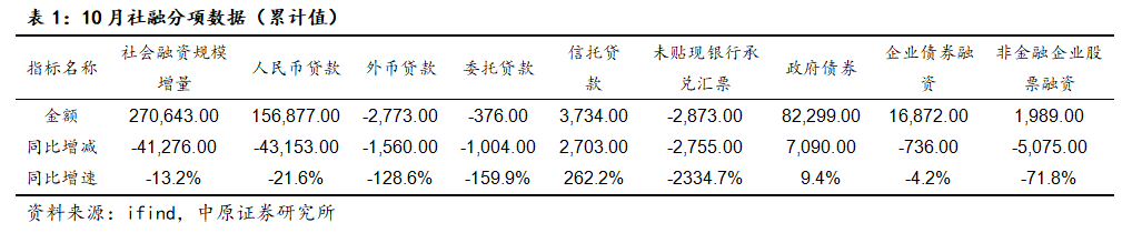 【10月社融数据偏弱】1-10月中国社融数据疲弱,仅政府债券融资和信托贷款同比增加,其他融资方式同比均有所下降。人行公布数据显示,前十个月社会融资规模增量累计同比减少4.13万亿元。