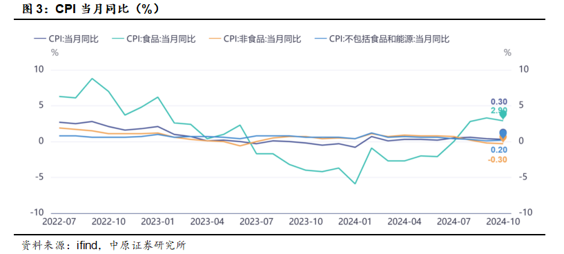 【CPI数据小幅回落】国家统计局数据显示,10月份CPI上涨0.3%,涨幅回落0.1%。食品中,鲜菜、猪肉和鲜果价格涨幅回落;非食品中,能源价格下降5.1%,其中汽油价格下降10.7%。扣除食品和能源价格的核心CPI略有回升。