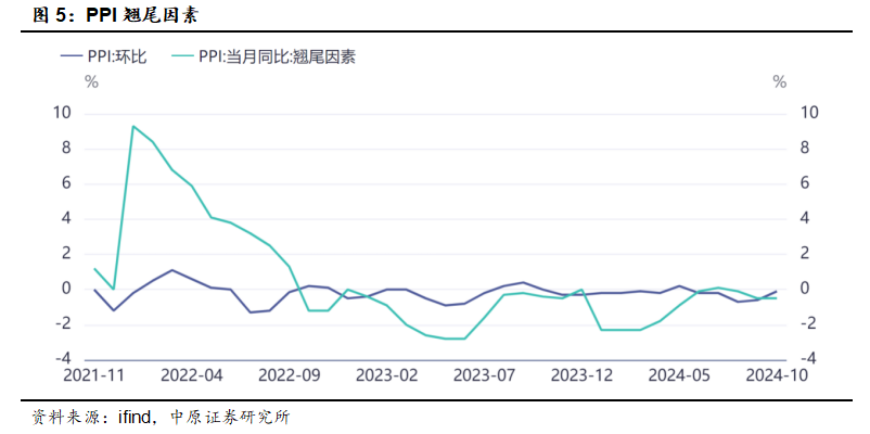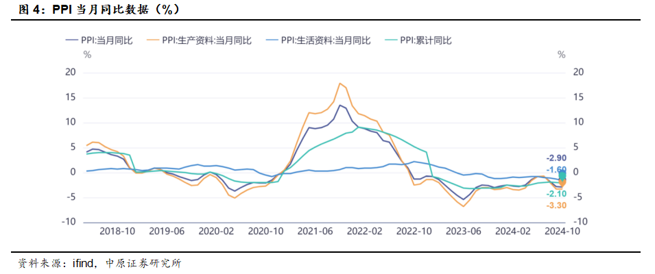 【PPI环比降幅连续两月收窄】10月份PPI下降0.1%,降幅比上月收窄0.5%。生产资料价格由环比下降转为环比上涨,主要由于建筑需求改善和煤炭业PPI提升。四季度CPI或将继续温和回升,PPI降幅将持续收窄。