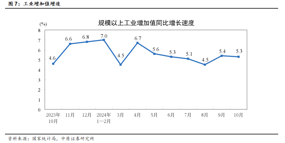 【10月工业增加值保持稳定】10月份规模以上工业增加值增长5.3%,采矿业、制造业、电力等生产和供应业均有所增长。新能源汽车产量增长48.6%。
