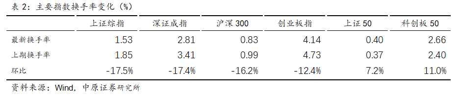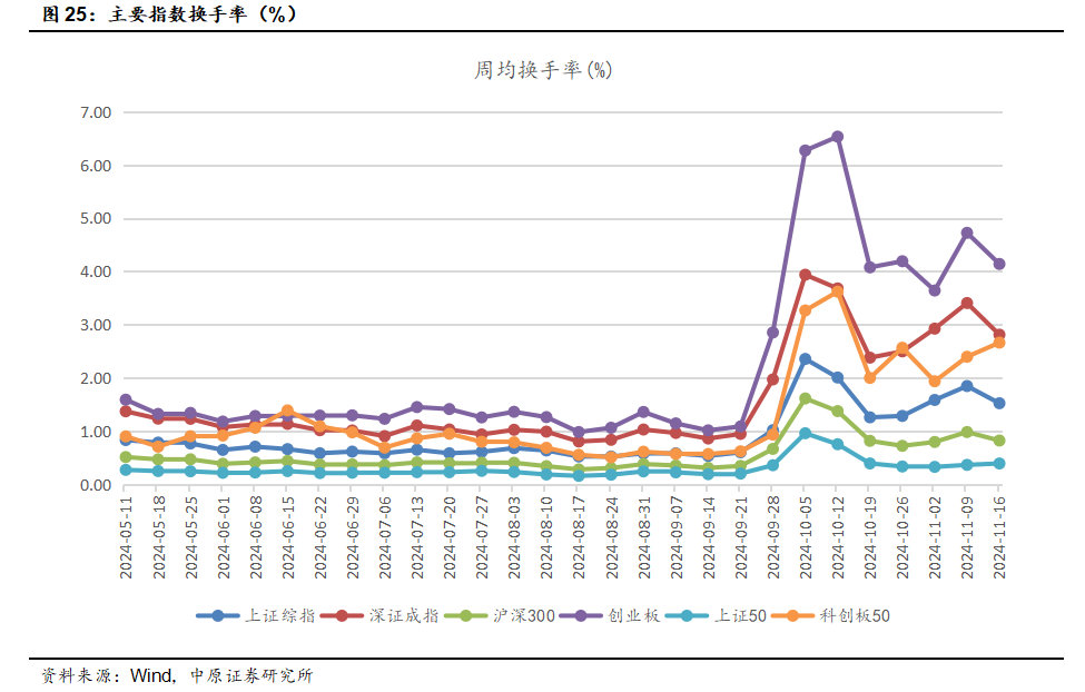 此外,上周全球指数普遍下跌,国内市场主要指数也全部下跌。融资余额有所增加,但增速放缓。申万A股、申万300、申万创业板市盈率均处于历史分数较低水平。市场情绪方面,风险偏好处于历史高位,换手率有所下降。