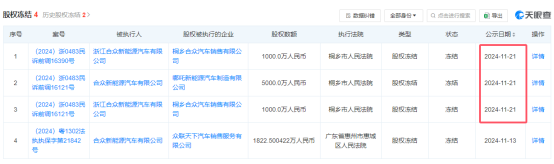 哪吒汽车相关负责人表示,上述公示的冻结金额数据有误,实际冻结金额为1000万元,而非10亿元。经合众新能源汽车有限公司申请,桐乡市人民法院已解除对合众新能源汽车股份有限公司持有的哪吒新能源汽车制造有限公司100%的股权采取的财产保全措施。