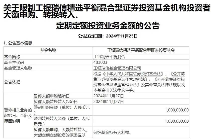 11月下旬,多家基金公司纷纷发布限购公告。工银瑞信精选平衡基金、国泰君安信息行业混合、中欧嘉泽混合基金等多只主动权益基金相继宣布限制大额申购。其中,工银瑞信精选平衡基金将机构投资者的大额申购上限设为100万元,国泰君安信息行业混合则直接暂停了申购业务。