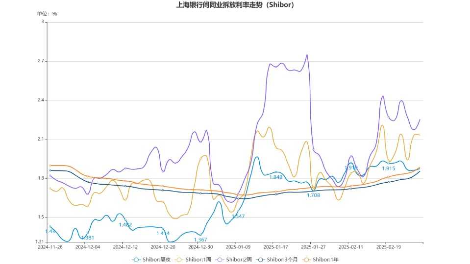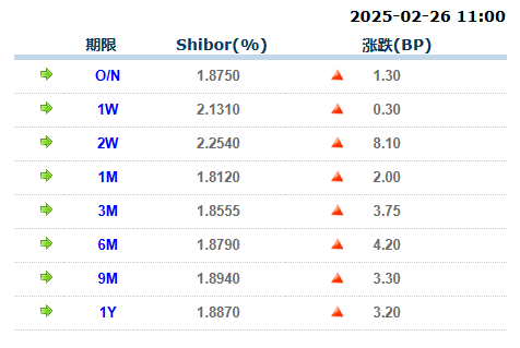 上海银行间同业拆放利率(Shibor)全线上涨,市场资金面出现波动。具体来看,隔夜Shibor上涨1.30BP至1.8750%,7天Shibor上涨0.30BP至2.1310%,14天Shibor上涨8.10BP至2.2540%,显示短期资金成本有所上升。