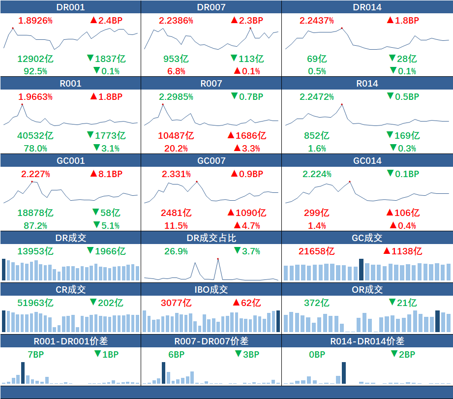 银行间质押式回购市场方面,短期资金利率波幅收窄,市场资金结构有所调整。DR001、R001加权平均利率分别上行,市场成交额也呈现不同变化。整体来看,资金面在日内经历较大波动,但最终保持宽松态势至收盘。
