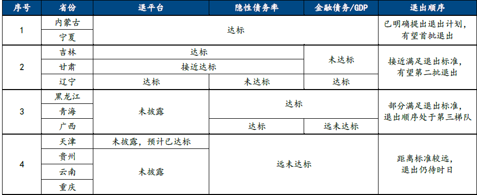 袁海霞表示,从指标来看,青海、宁夏、广西、内蒙古、吉林、黑龙江等省份的隐性债务率较低,辽宁、宁夏、黑龙江、青海、内蒙古的金融债务/GDP比例不高。然而,部分满足退出标准的省份或因某项指标未达标或因信息未披露,退出顺序可能延后。天津、贵州、云南、重庆等省份距离退出标准仍较远。