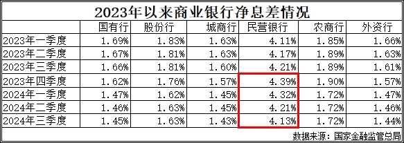 尽管如此,民营银行的净息差依然高于其他类型银行。然而,从趋势来看,民营银行的净息差在快速收窄。去年,民营银行的净息差还曾逆势走高,但今年一季度末、二季度末、三季度末,净息差分别为4.32%、4.21%、4.13%。而其他类型银行的净息差虽有收窄,但幅度不大。