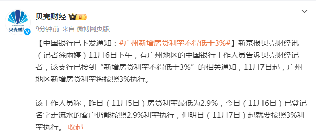 11月6日下午,广州地区中国银行某支行工作人员向贝壳财经记者透露,该支行已收到正式通知,要求从11月7日起,所有新增房贷利率不得低于3%。这一调整意味着,广州地区的房贷利率将迈入新的阶段。