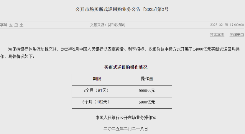 为保持银行体系流动性充裕,2025年2月中国人民银行(下称“央行”)以固定数量、利率招标、多重价位中标方式开展了1.4万亿元买断式逆回购操作,期限为3个月(91天)9000亿元和6个月(182天)5000亿元。当天,央行发布公告称,2月未开展公开市场国债买卖操作。