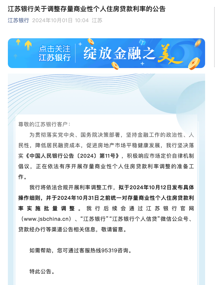 江苏银行率先表态,称将坚决落实《中国人民银行公告〔2024〕第11号》,依法有序开展存量商业性个人住房贷款利率调整的准备工作,并计划于2024年10月12日发布具体操作细则,于10月31日前完成批量调整。