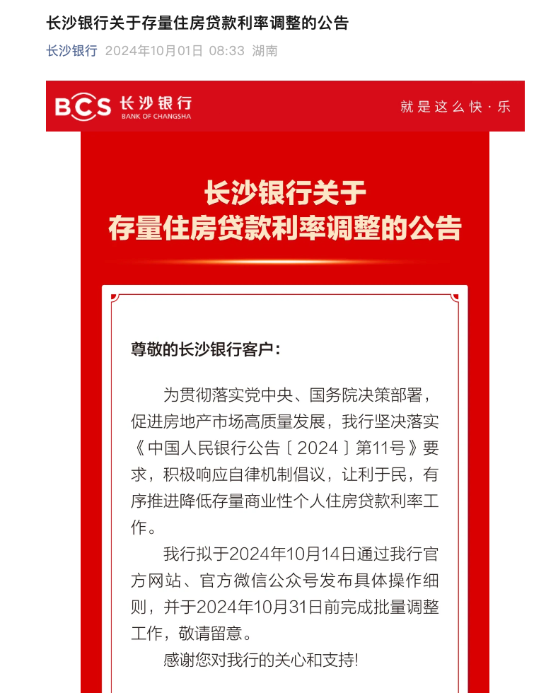 长沙银行也于同日发布公告,表示将于2024年10月14日通过其官方网站和官方微信公众号发布具体操作细则,同样计划在10月31日前完成批量调整工作。