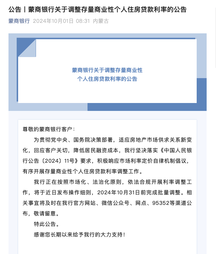 蒙商银行等其他多家中小银行机构,如四川银行、徽商银行、厦门银行、苏州银行、泉州银行、富滇银行,以及大竹农商银行、河南农商联合银行、云南农信社等,也均在10月1日发布了相关公告,表示正在依法合规开展利率调整工作,并将在10月31日前完成批量调整。